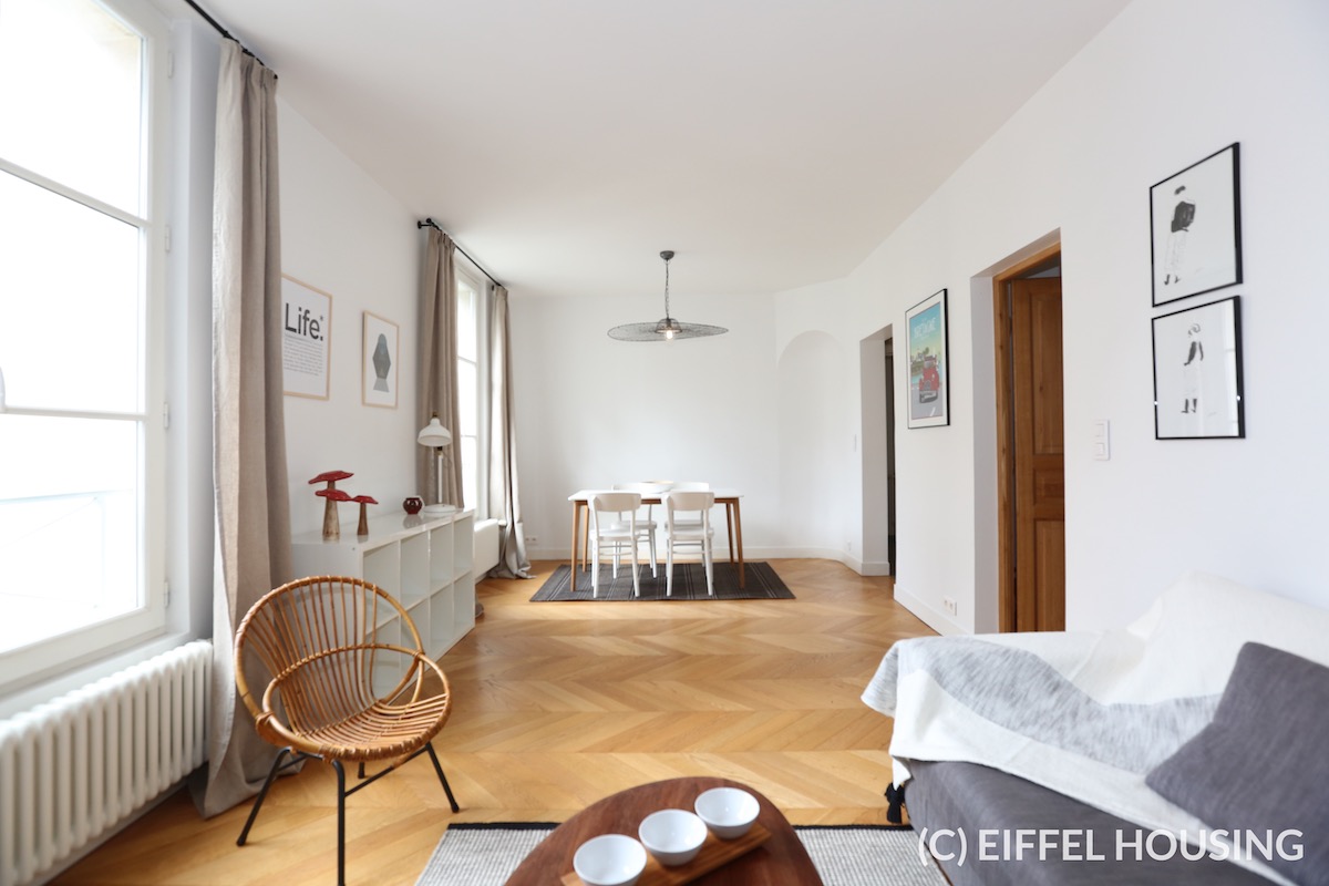Ameublement et décoration sobres et raffinés. Belle hauteur sous plafond, matériaux de qualité. Nombreux rangements.