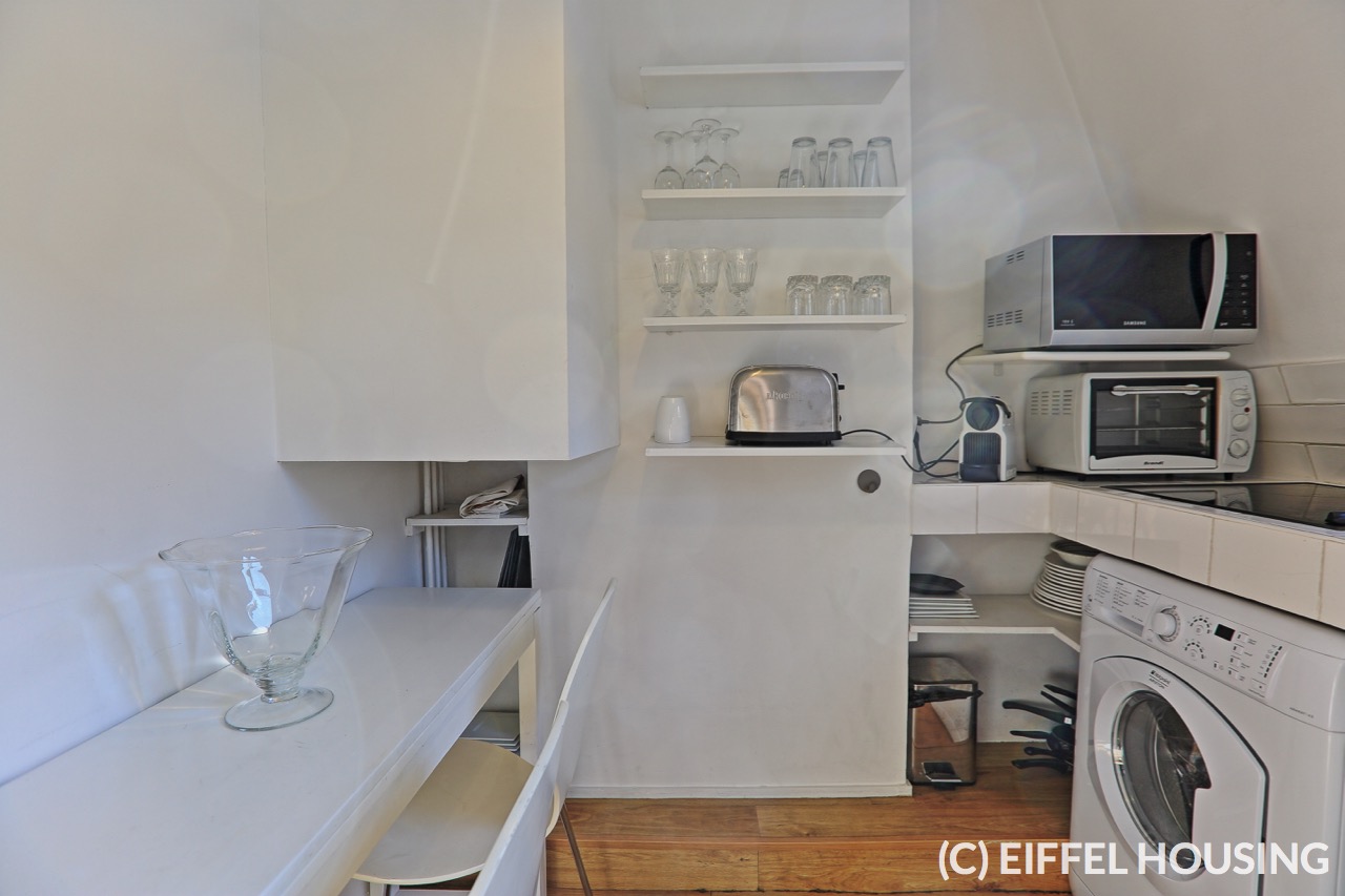 L’appartement se compose d’un séjour avec cuisine ouverte tout équipée (lave-vaisselle, lave-linge séchant, plaques, four), d’une chambre avec de nombreux rangements, et d’une salle de bains avec WC. Beaucoup de rangements, fenêtres double-vitrage.