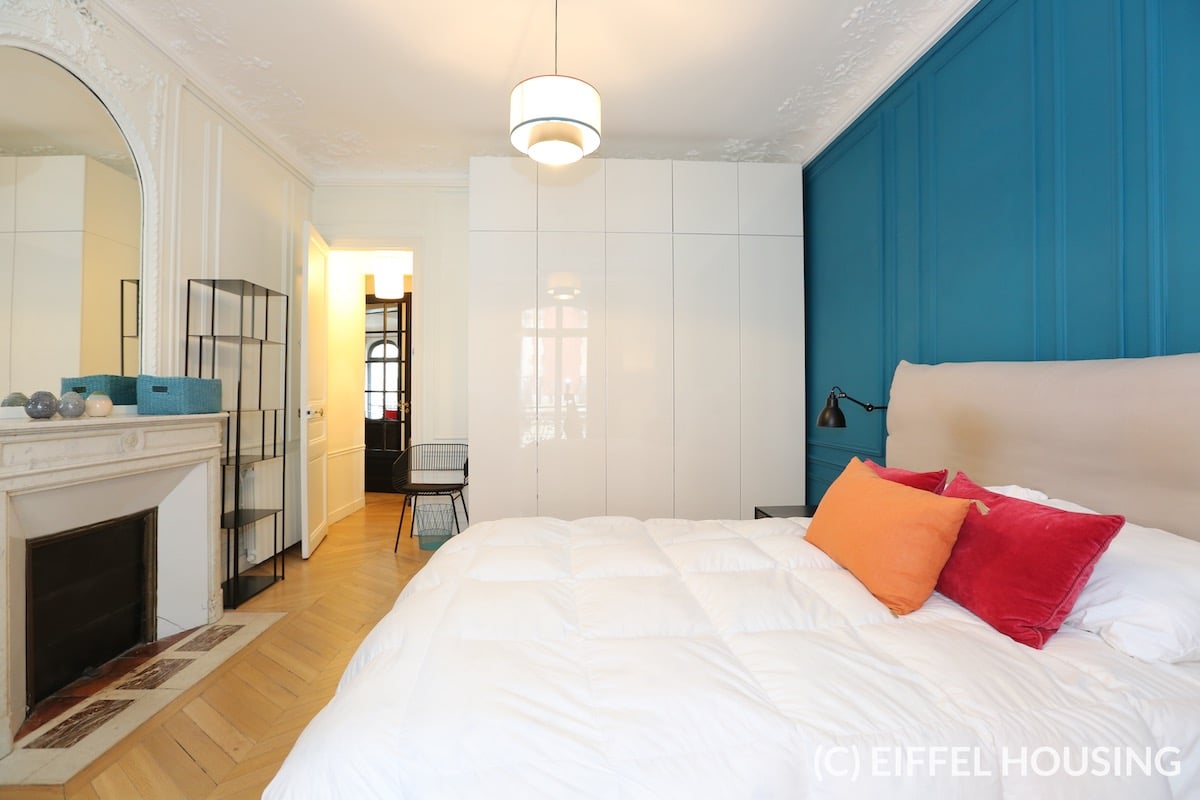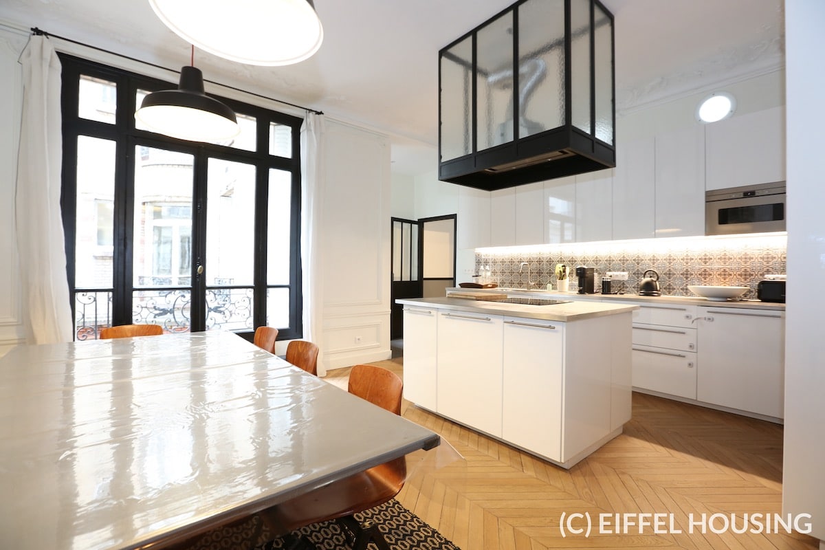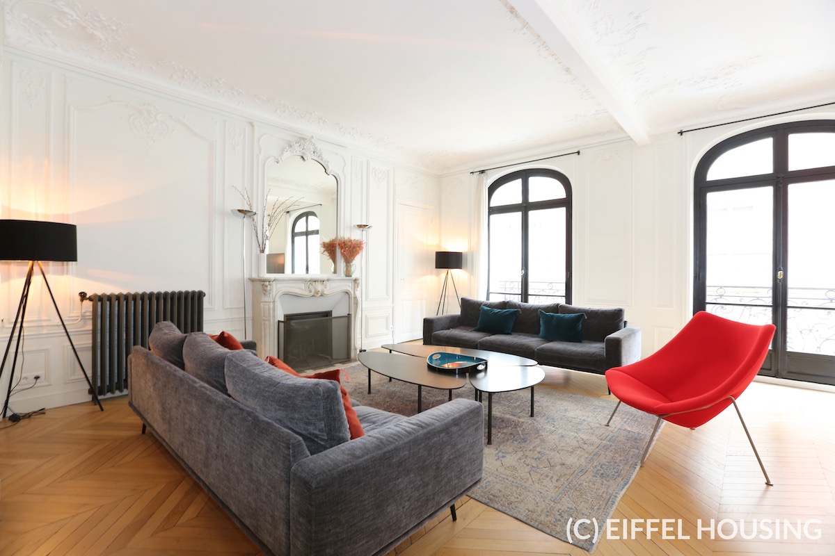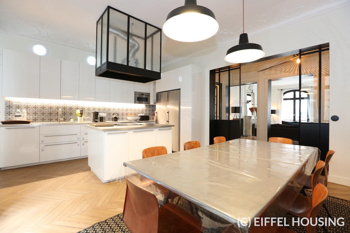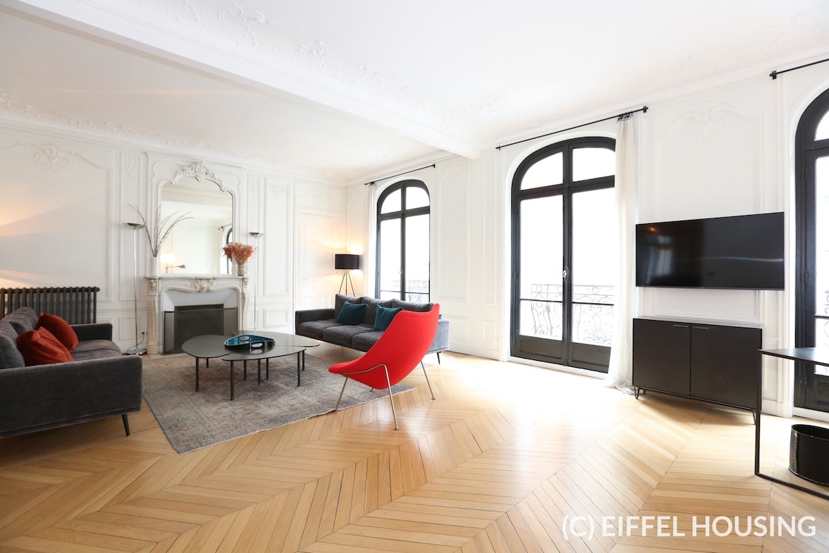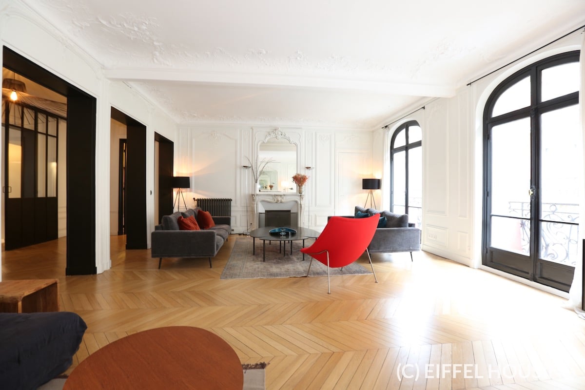 Nombreux rangements. Ameublement contemporain et haut de gamme. Tout le charme de l’ancien : parquet en pointe de Hongrie, moulures, cheminée. Belle hauteur sous plafond.