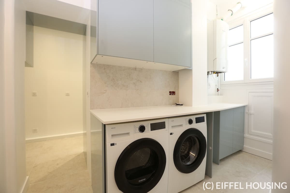 - une cuisine séparée et équipée et une buanderie (avec lave-linge et sèche-linge)