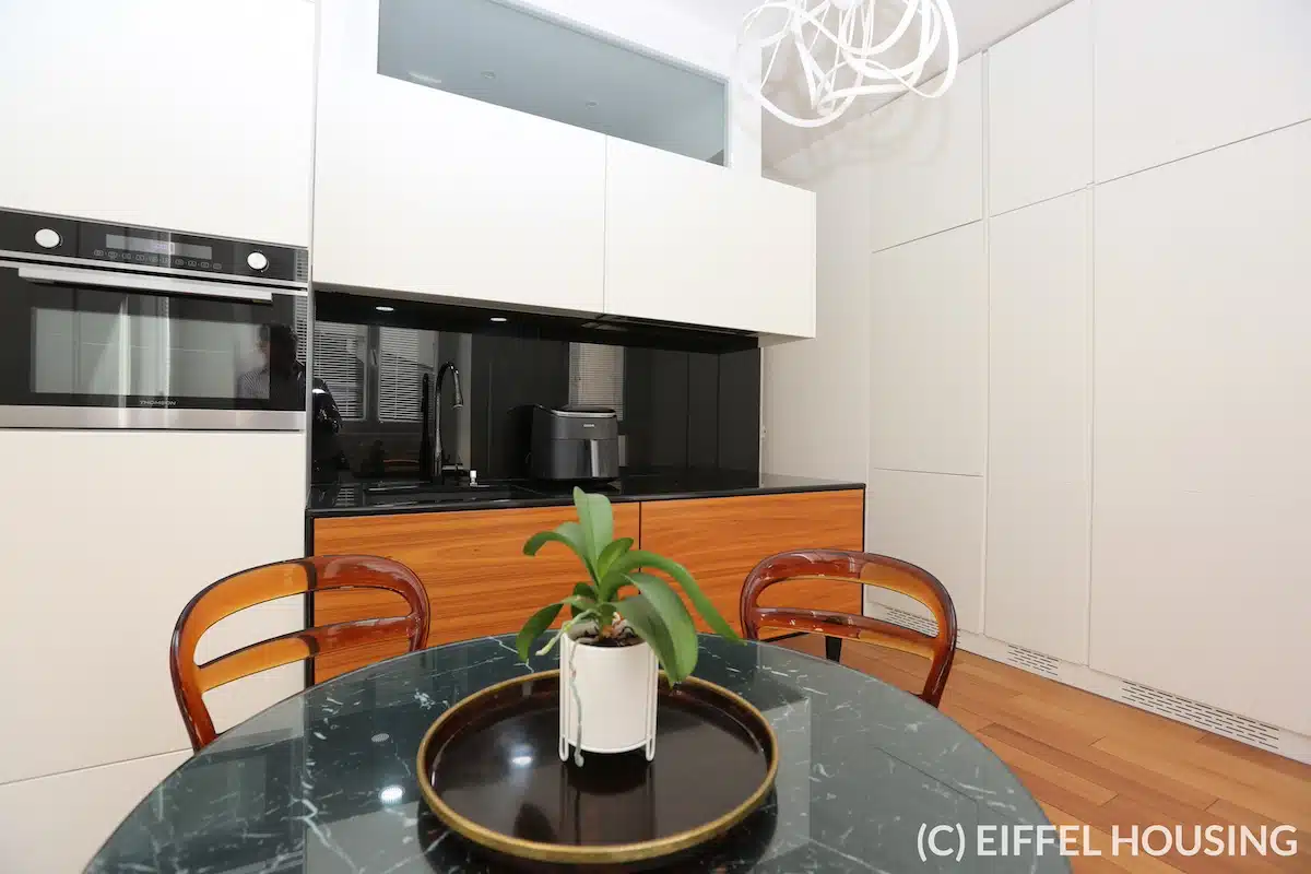 - d’une cuisine séparée et entièrement équipée (une table est en train d’être montée)