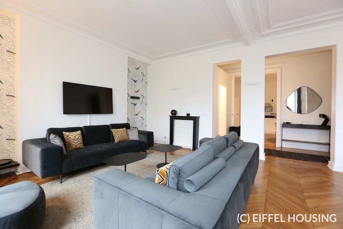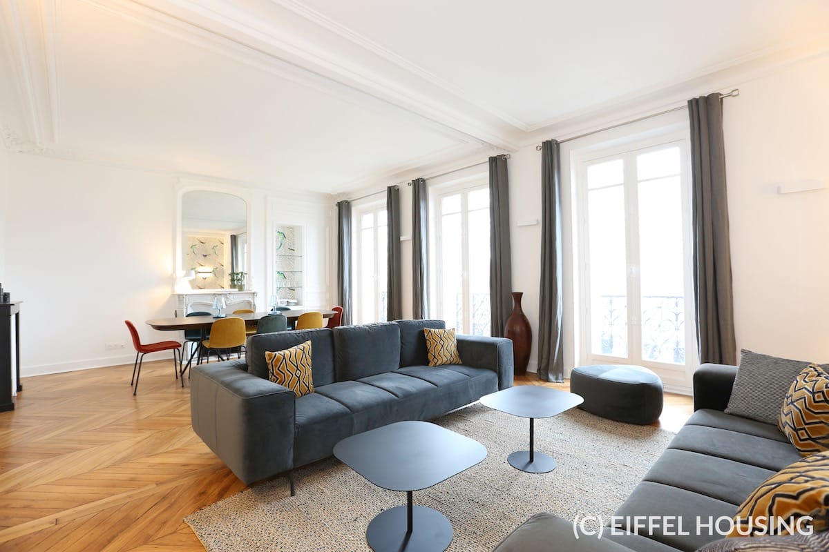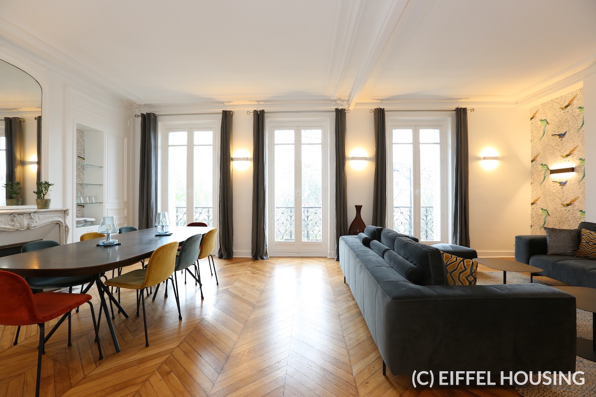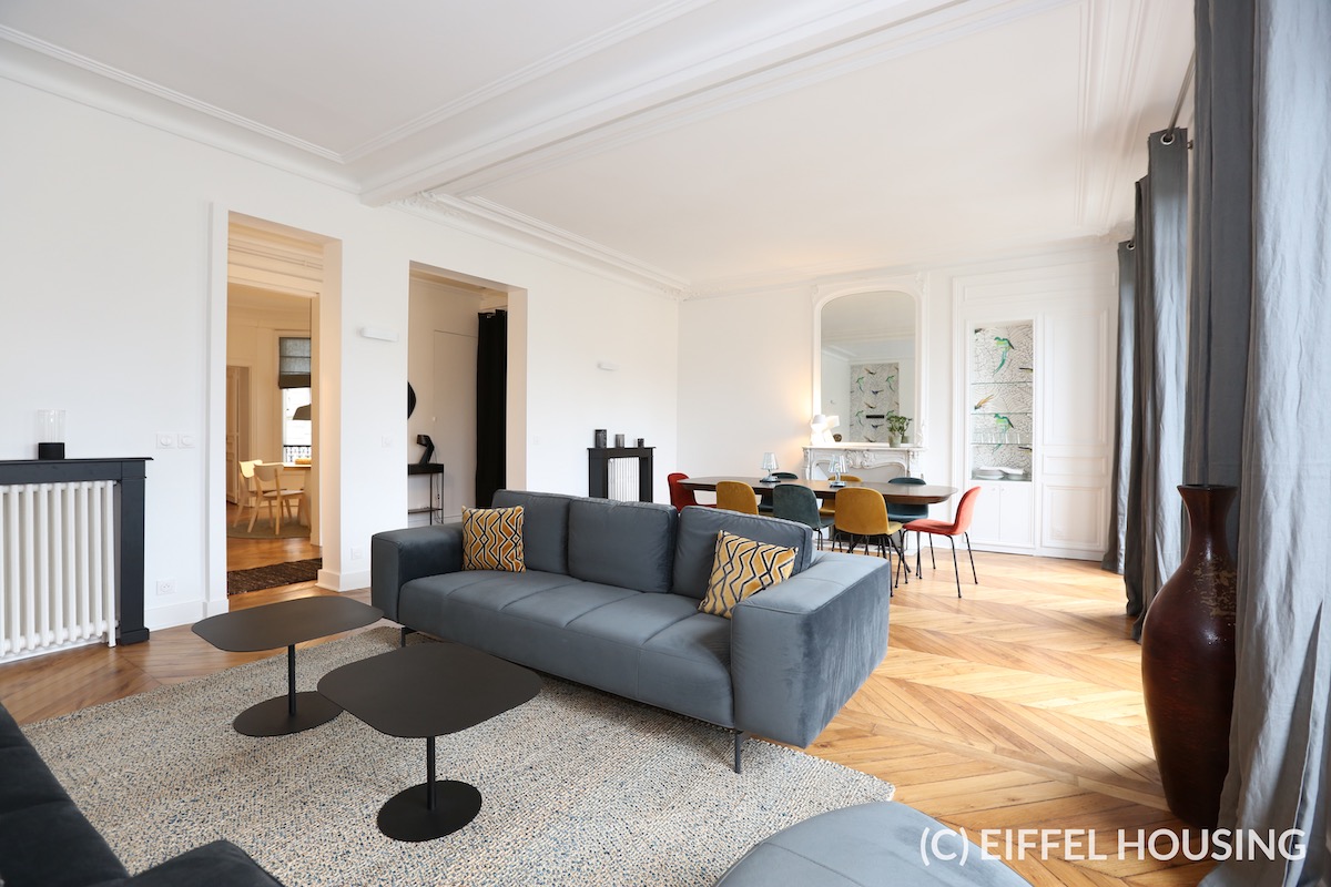 Ameublement haut de gamme, moulures et belle hauteur sous plafond.