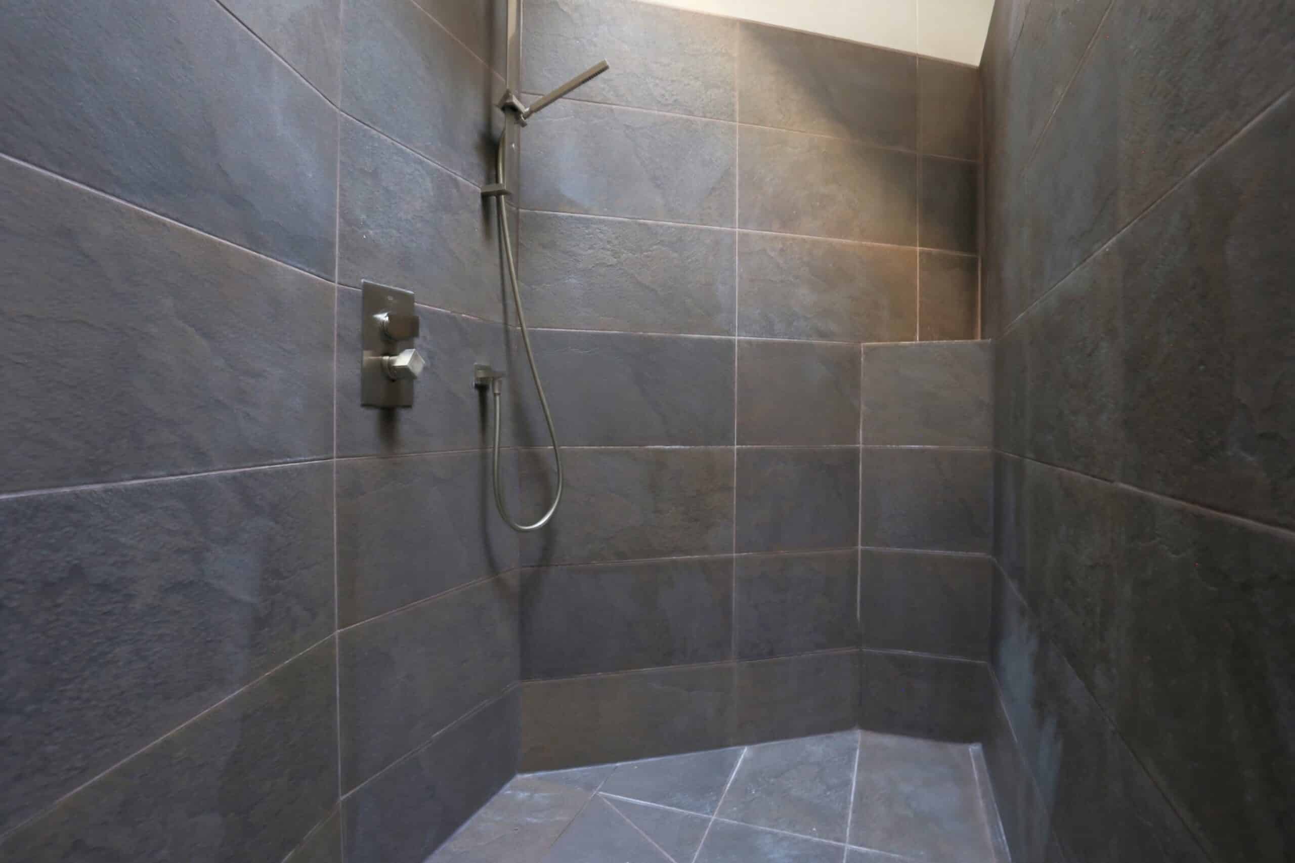 - Une salle de bain avec douche et baignoire