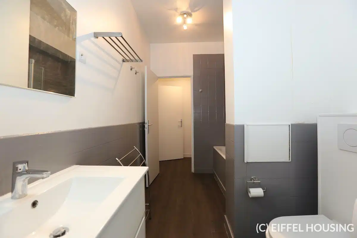 L’appartement se compose d’une entrée, d’un très grand séjour (~ 35m2) avec une cuisine ouverte et son îlot central, une chambre séparée, une salle de bains avec WC, un dressing.