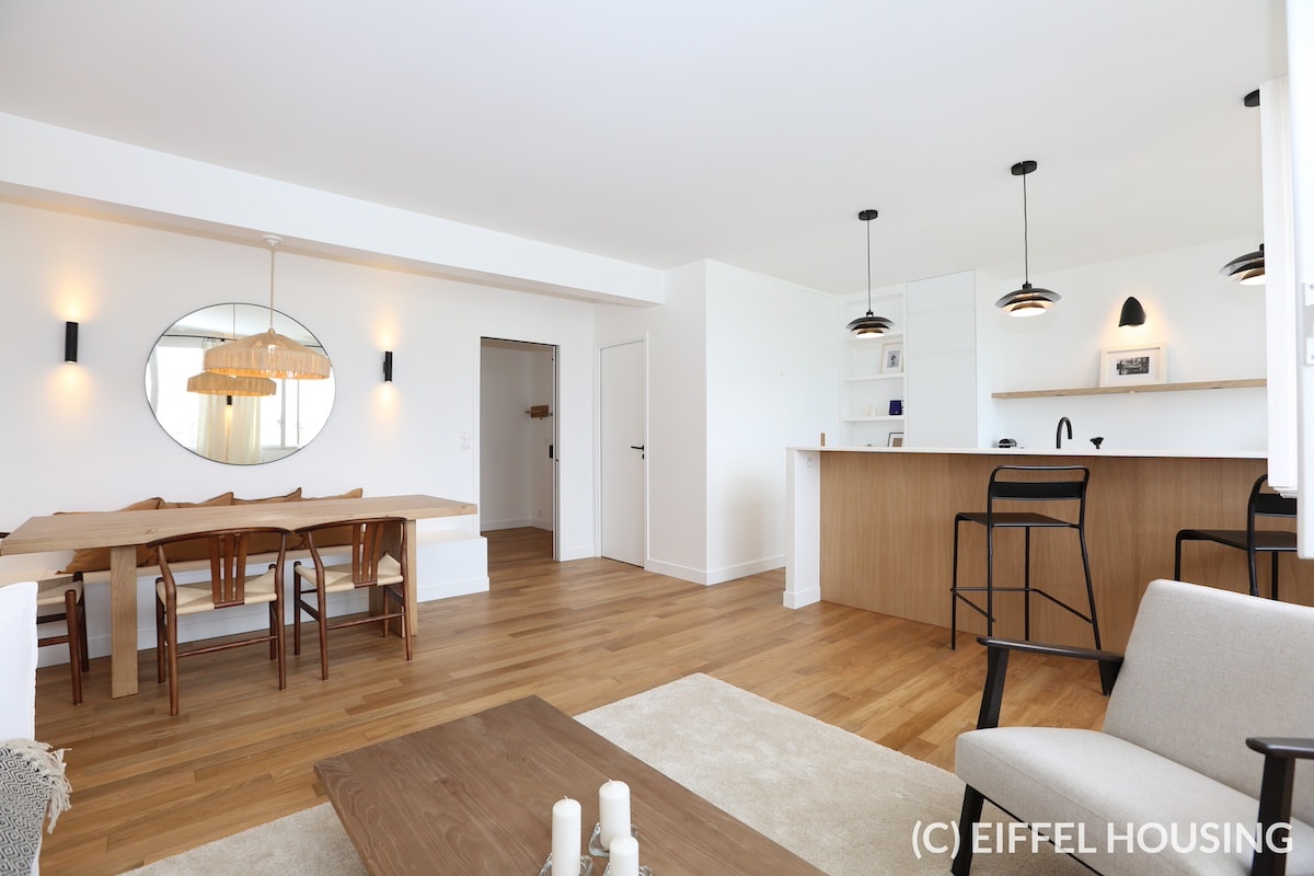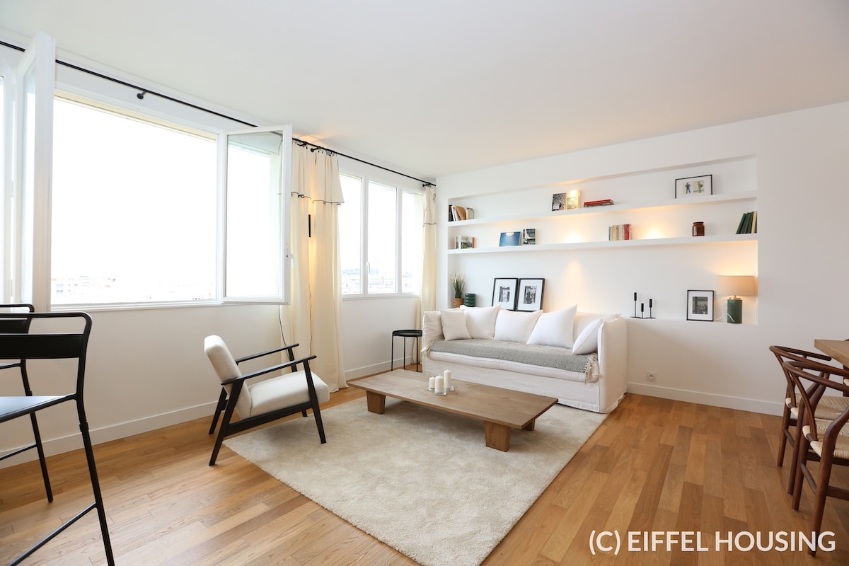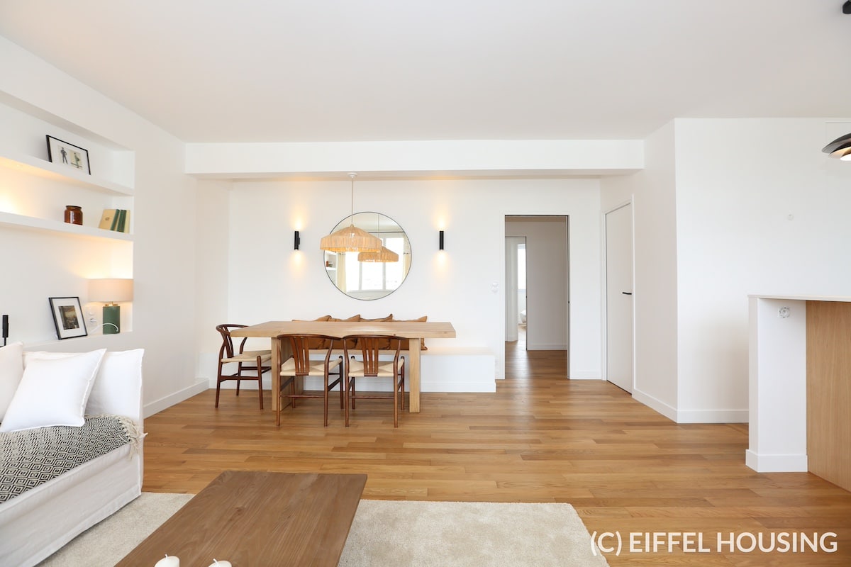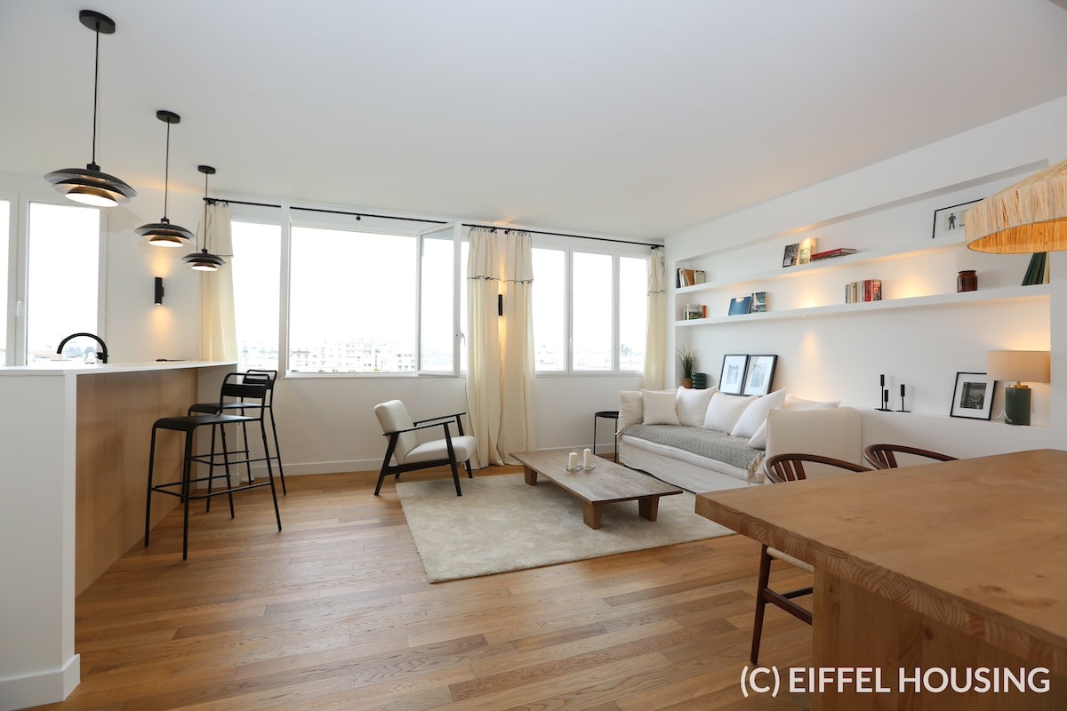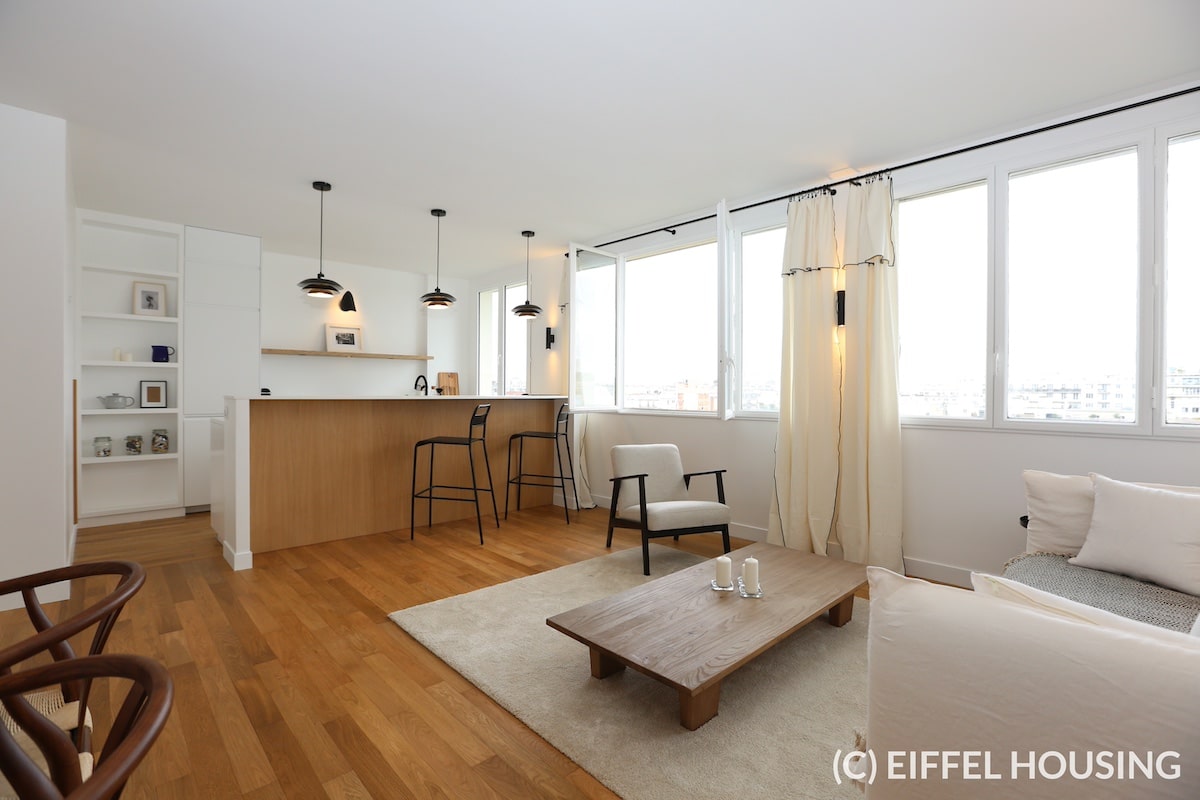 Appartement refait à neuf. Mobilier neuf et contemporain. Appartement traversant et baigné de lumière avec une vue Tour Eiffel depuis le salon.