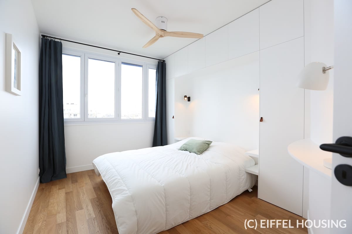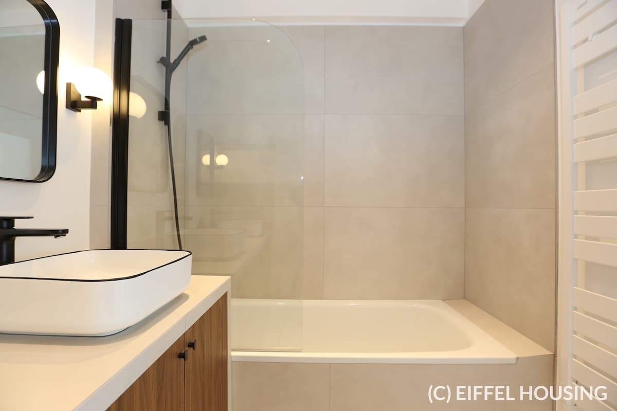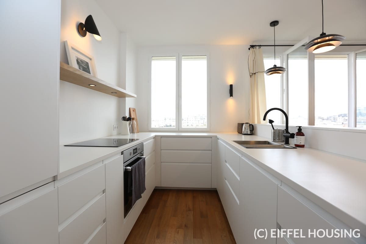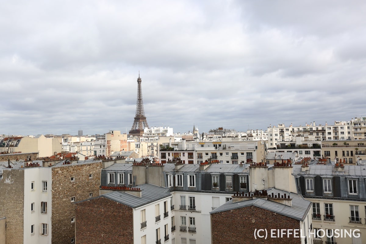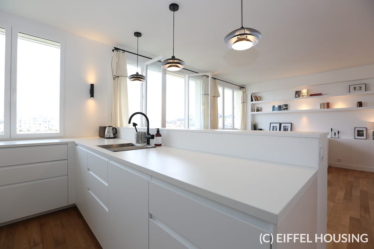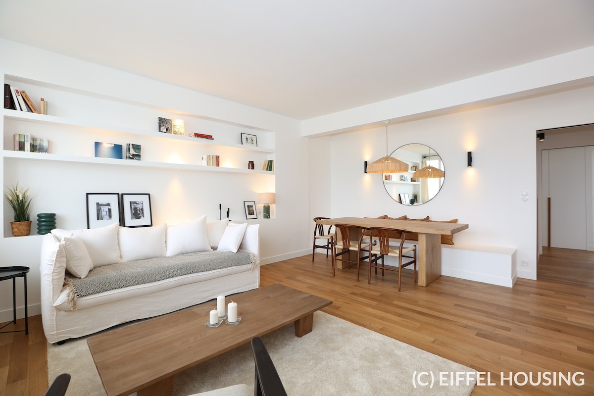 Appartement refait à neuf. Mobilier neuf et contemporain. Appartement traversant et baigné de lumière avec une vue Tour Eiffel depuis le salon.