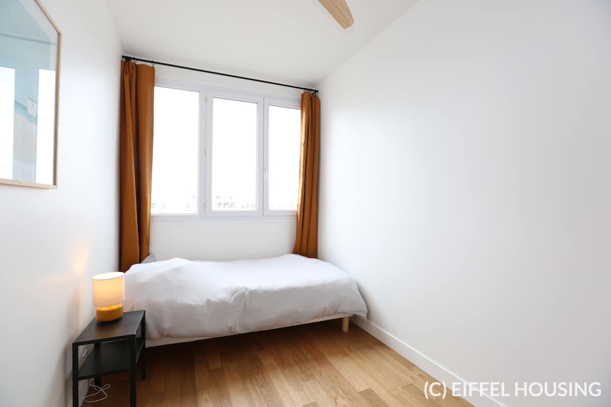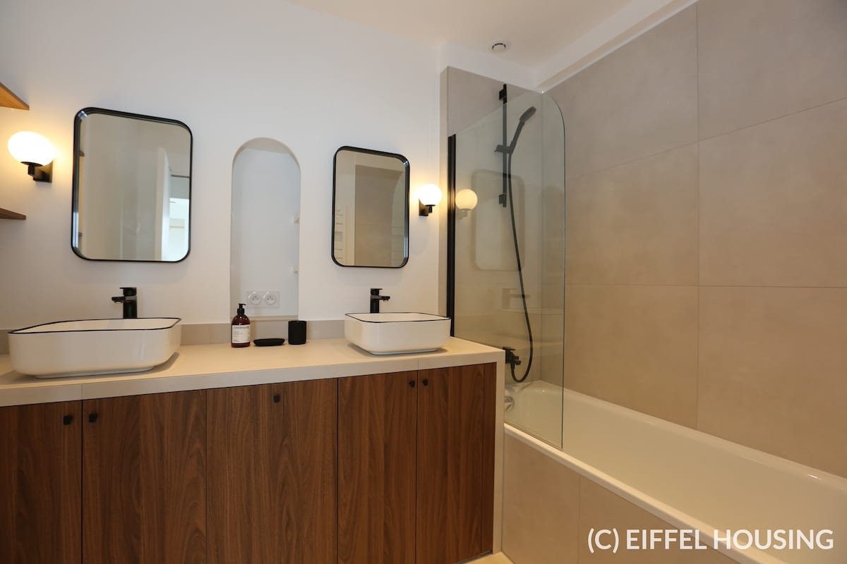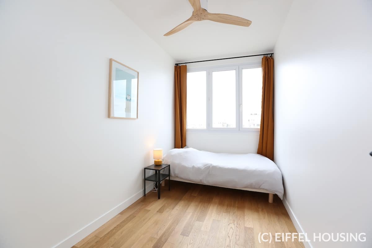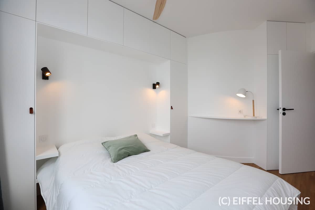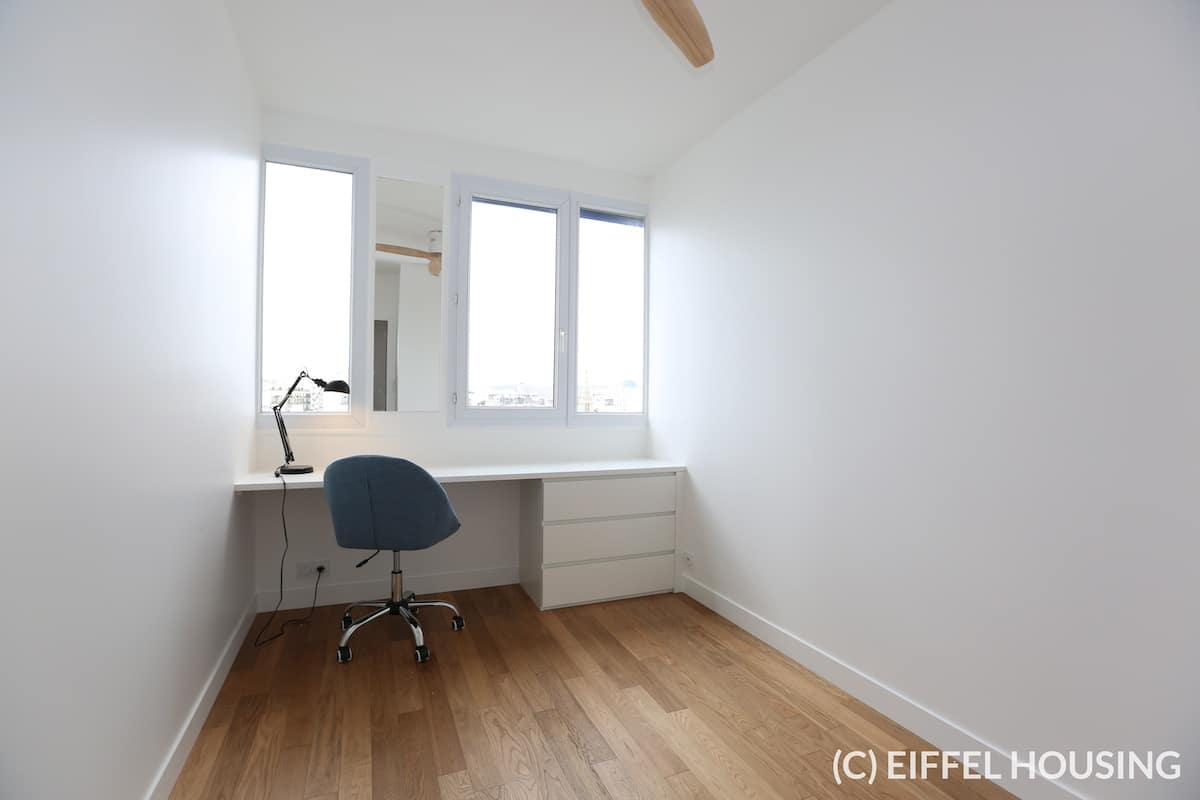 Appartement refait à neuf. Mobilier neuf et contemporain. Appartement traversant et baigné de lumière avec une vue Tour Eiffel depuis le salon.