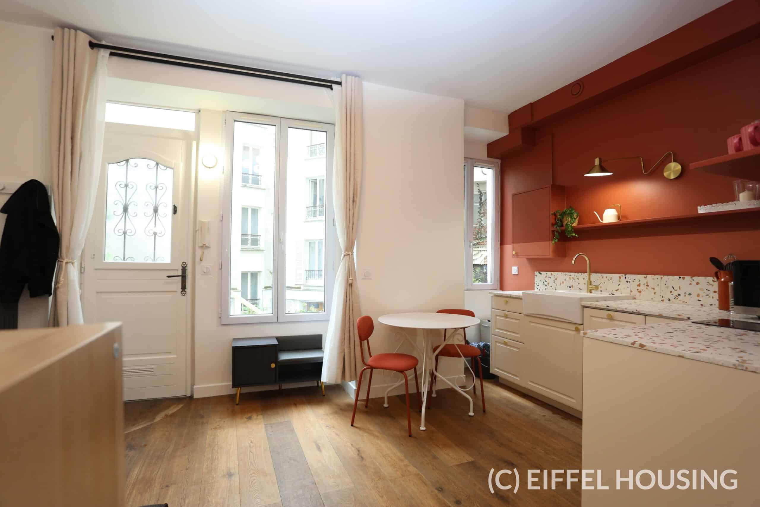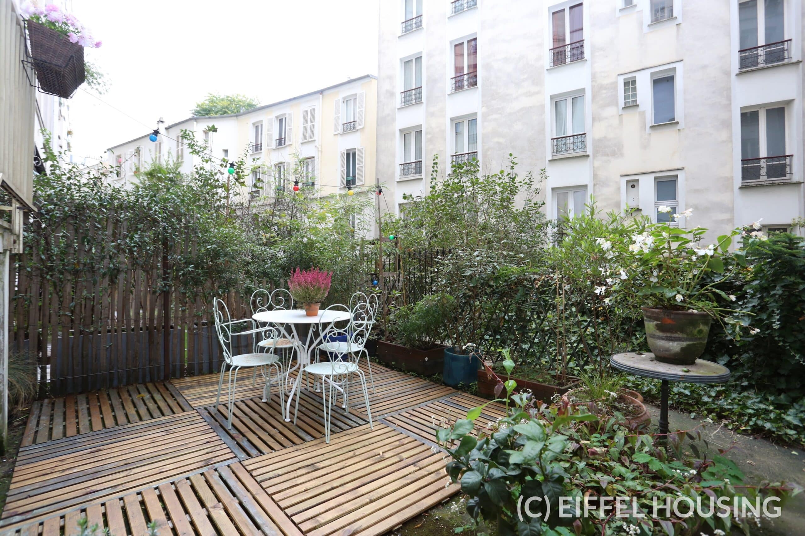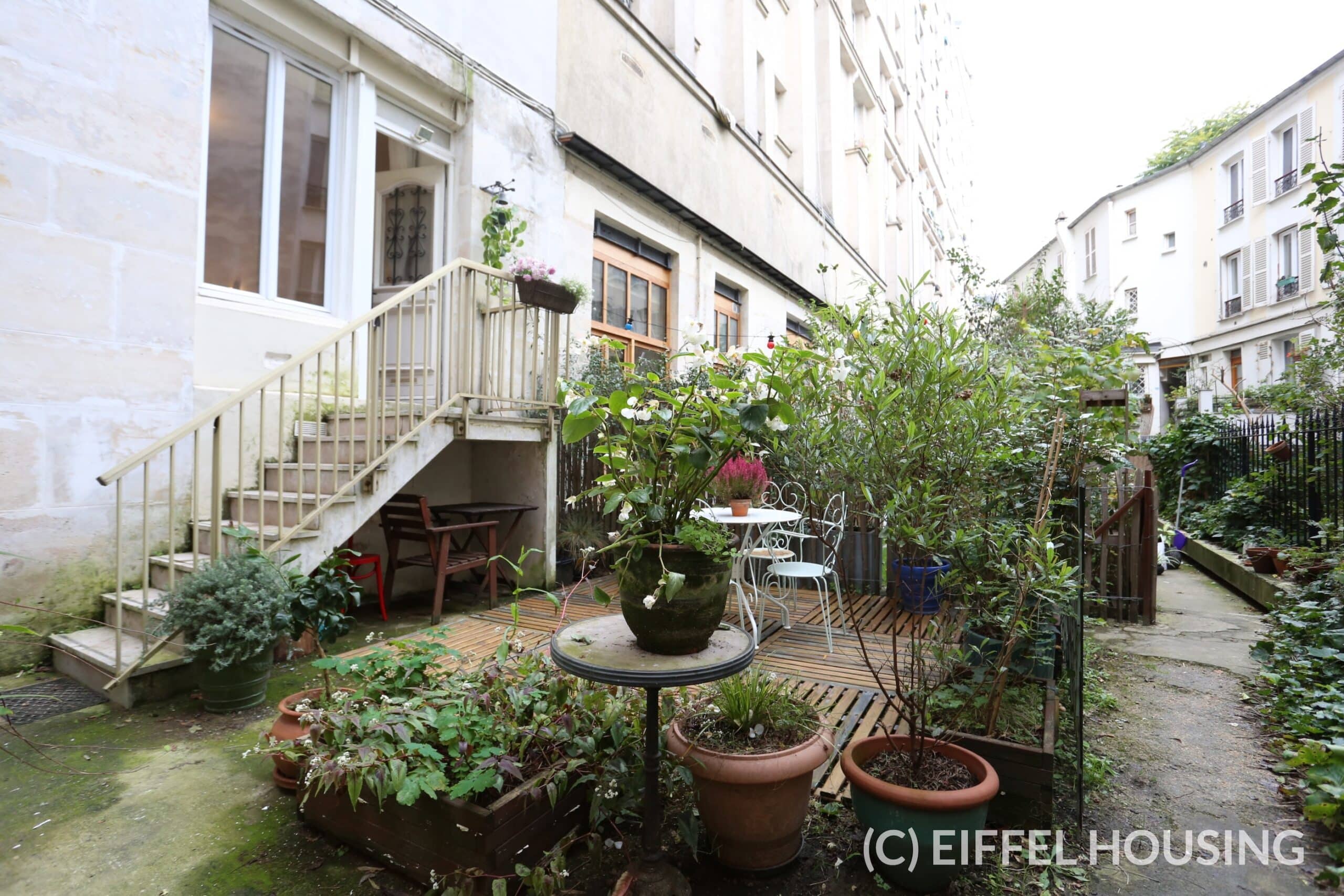 Magnifique studio avec terrasse privative, refait à neuf et loué meublé, en rez-de-chaussée (intégralement sur cour). Situé Rue Maurice Utrillo dans le 18ème arrondissement de Paris, à proximité immédiate de la Basilique su Sacré-Coeur de Montmartre, de nombreux commerces et restaurants. Proche du métro Abbesses (ligne 12).