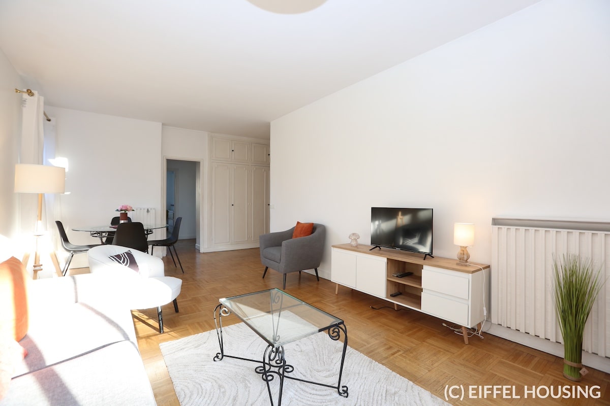 Cet appartement calme (immeuble en retrait de la rue Pauline Borghèse) bénéficie d’une double exposition et d’une très belle luminosité.