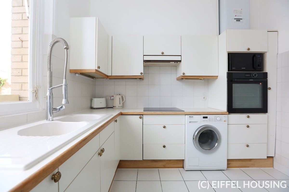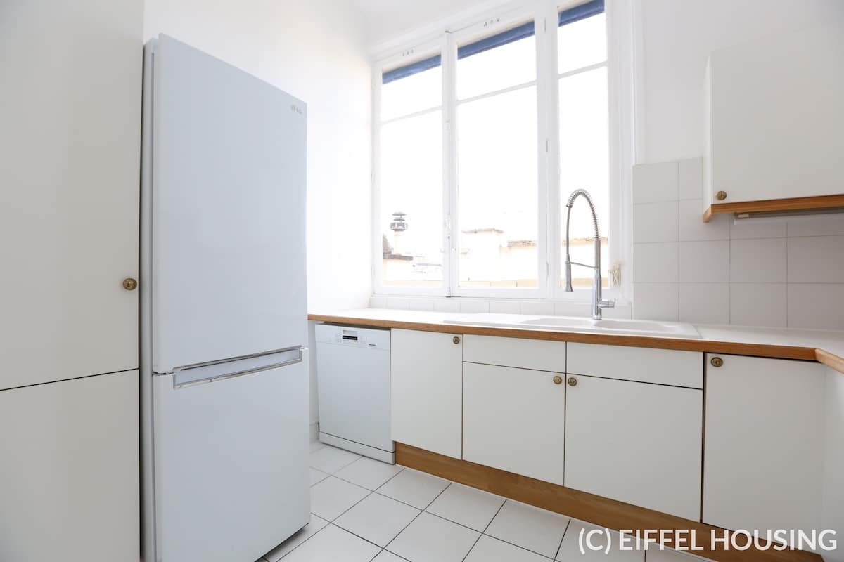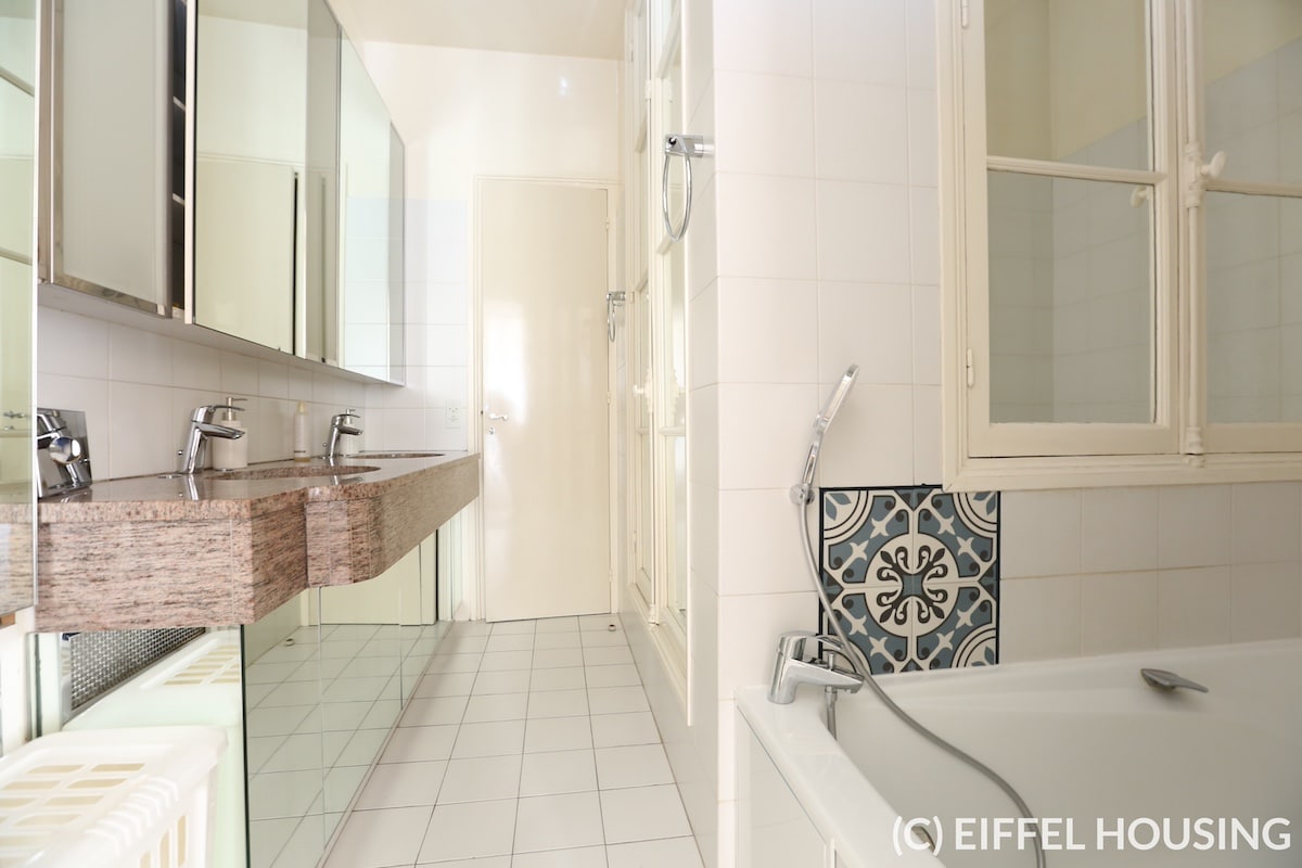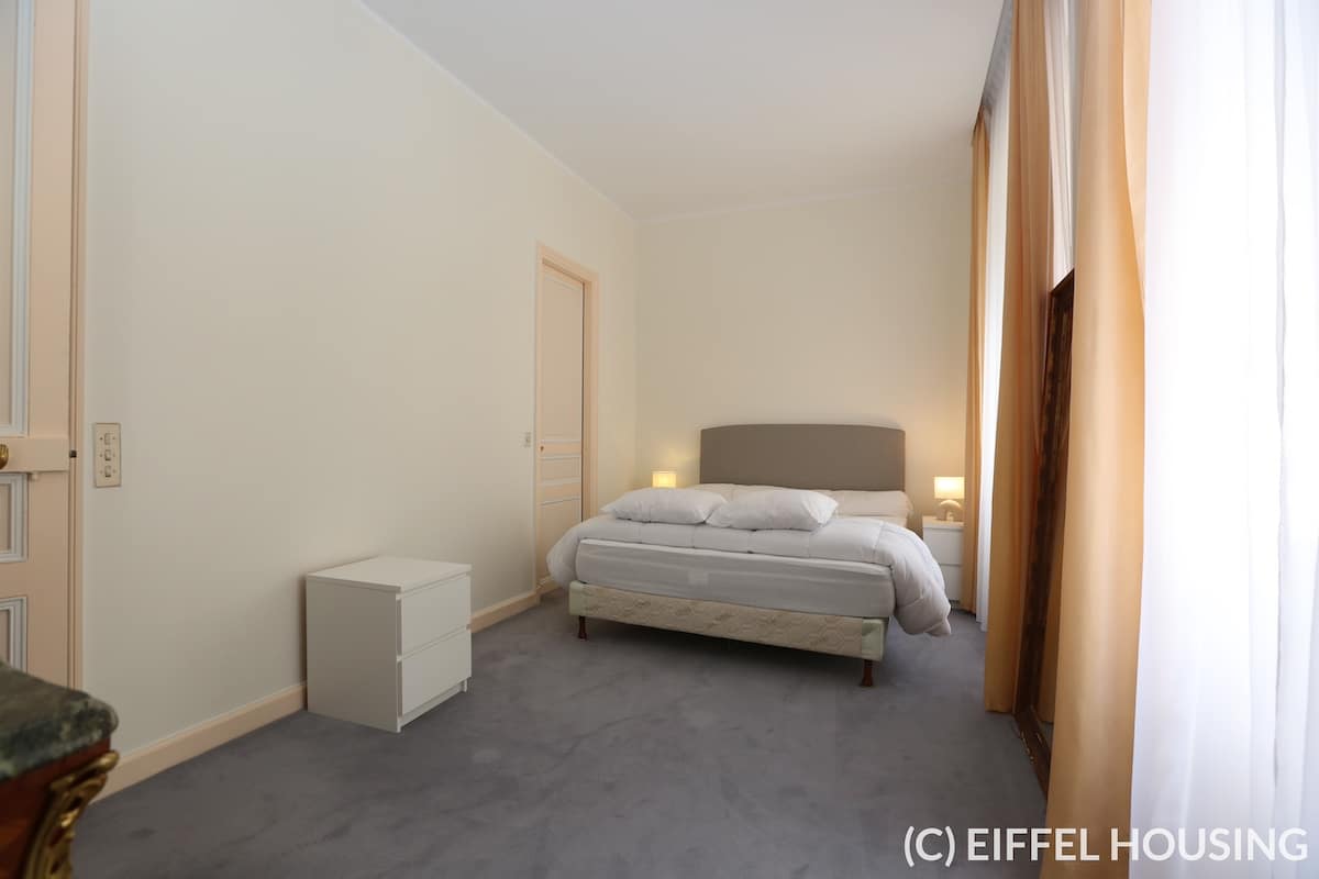 - une chambre principale (sur le square du Trocadéro) avec sa salle de bains et WC, ainsi qu’un dressing,