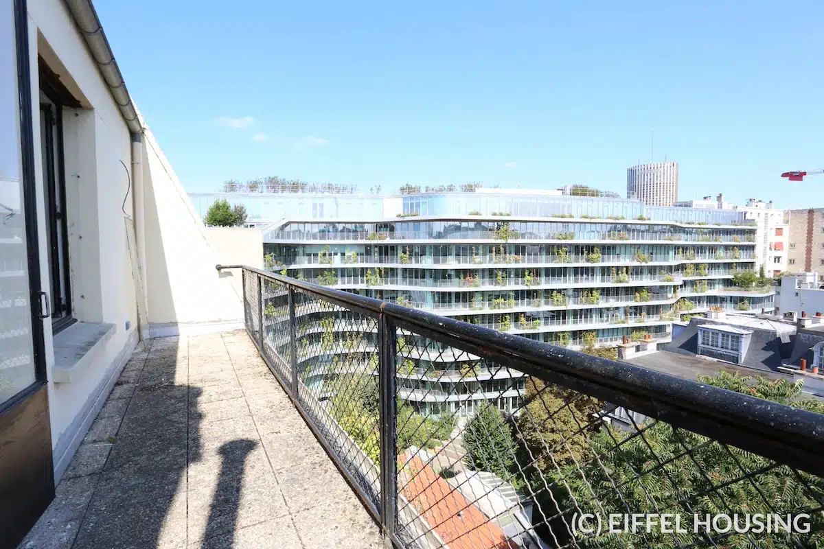 Les deux terrasses se situe de chaque côté de l’appartement. L’une d’elle offre une vue sur la Tour Eiffel.