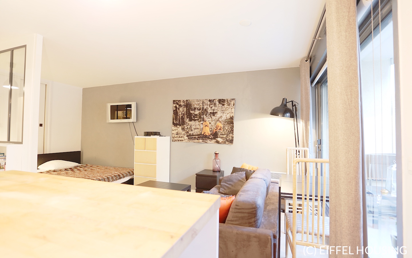 This 68 sqm property includes 1 large living room (very quiet) with its fully fitted kitchen separated from the living room by a glass panel , 2 bedrooms (each with a double bed), 1 bathroom (with bath tub), 1 separate toilet.