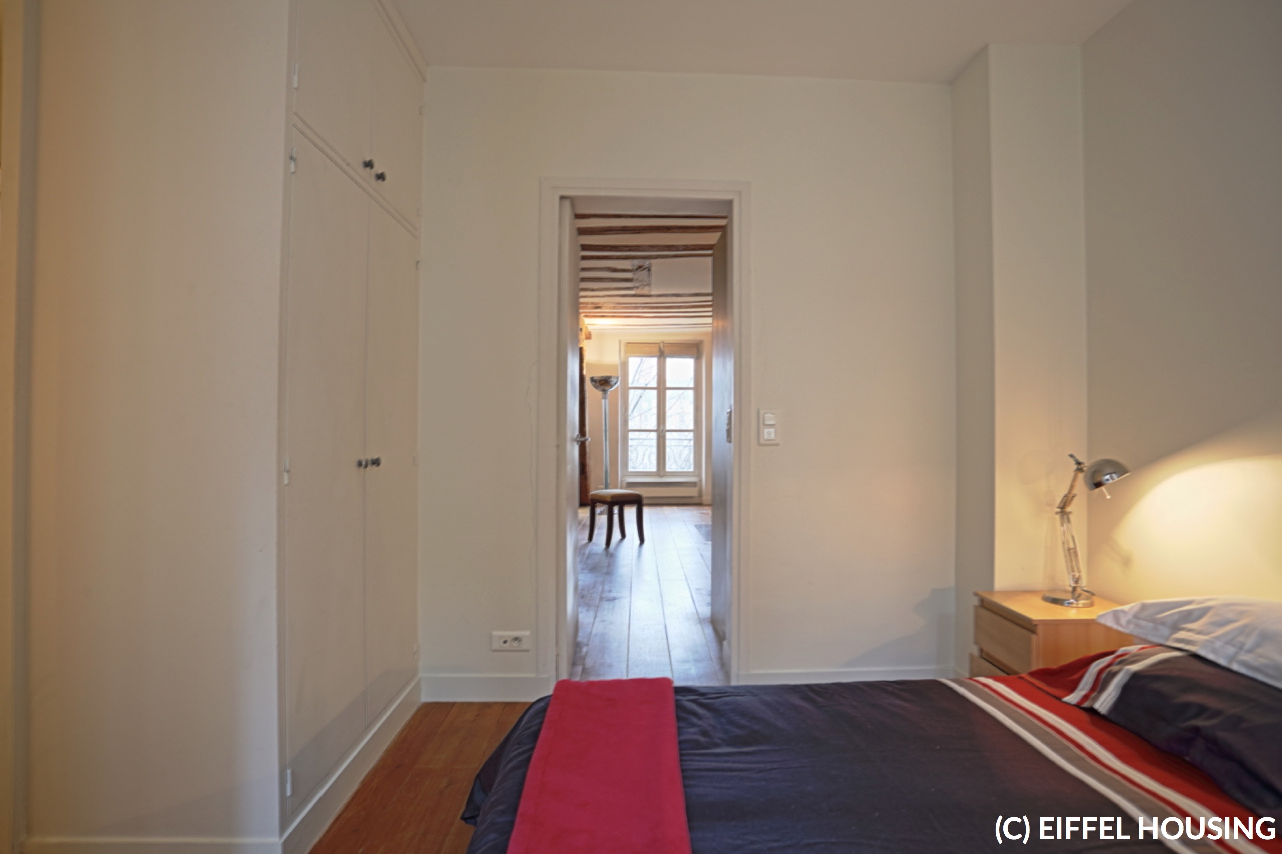 The apartment is facing a very quiet courtyard and features a spacious living room, a fully-fitted open kitchen (dishwasher, washing and drying machine, cooktop, oven), a bedroom and a bathroom with toilets.