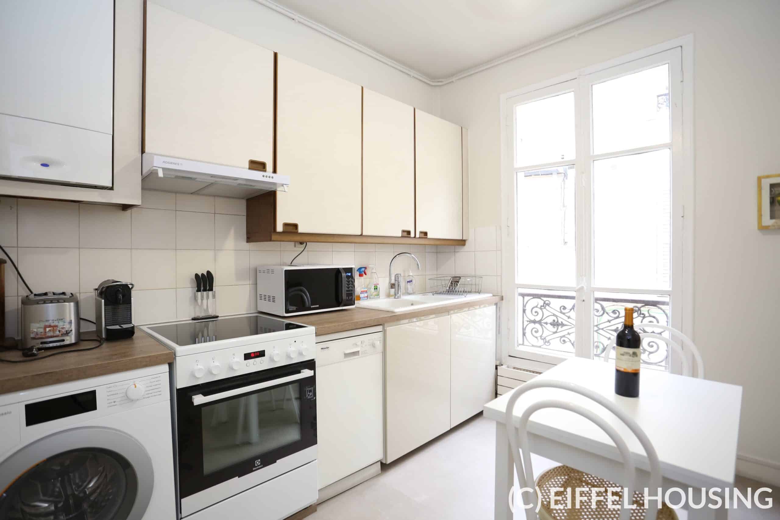 Located on the 4th floor (with elevator) for a surface of 75 sqm, the apartment is composed by an entrance hall, a very bright large living room with a fully equipped open kitchen (hotplates, hoods, dishwasher, wine cellar, etc.), two bedrooms (one on the courtyard can be adapted according to the tenant’s needs), two shower rooms (one including a washing machine dryer) and a separate toilet.