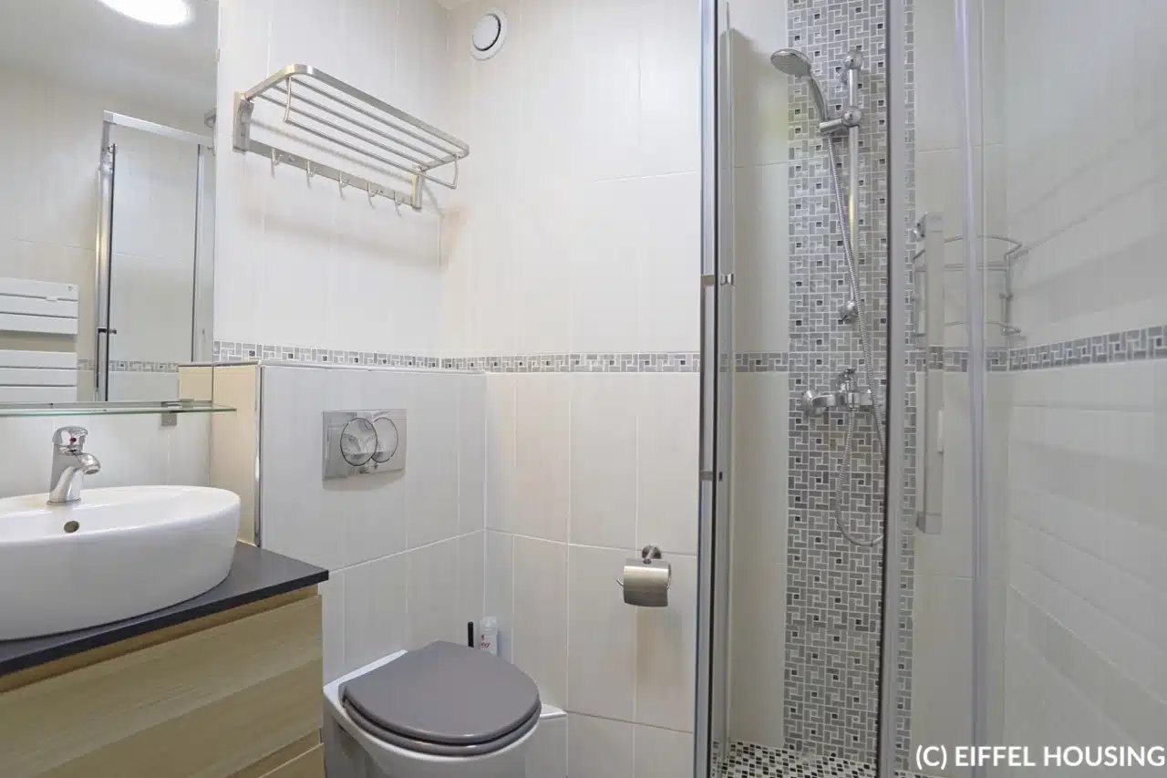 The apartment includes 1 double living room, 3 large bedrooms, 3 bathrooms (with showers), 2 WC balcony. The kitchen is fully equipped. Large storage capacity.