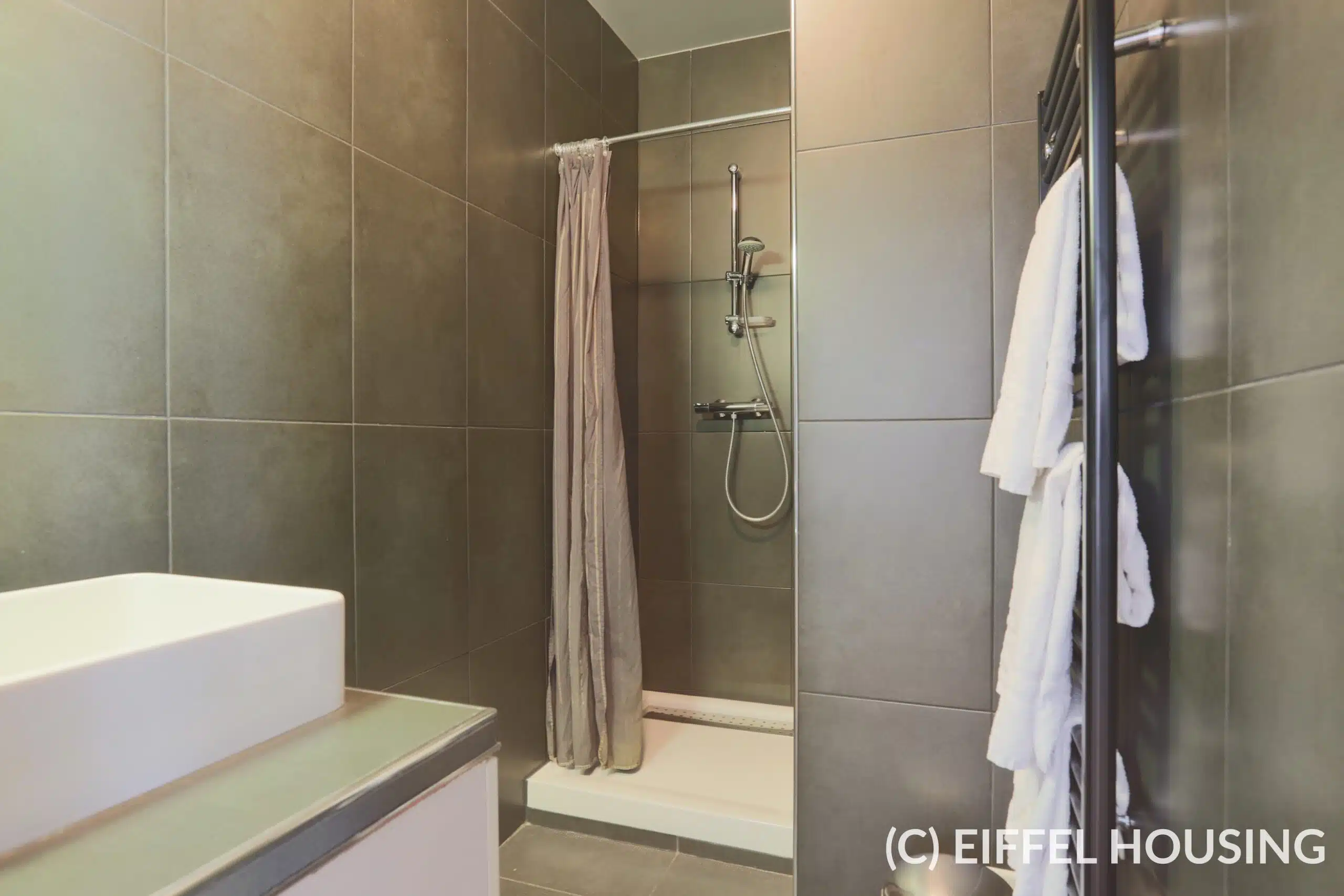 The apartment is on the 3rd floor (with elevator) of a building in rue Léopold Bellan. It includes one living room, two bedrooms (each with a double bed), one fully fitted kitchen, two bathrooms (with shower) and one toilet.