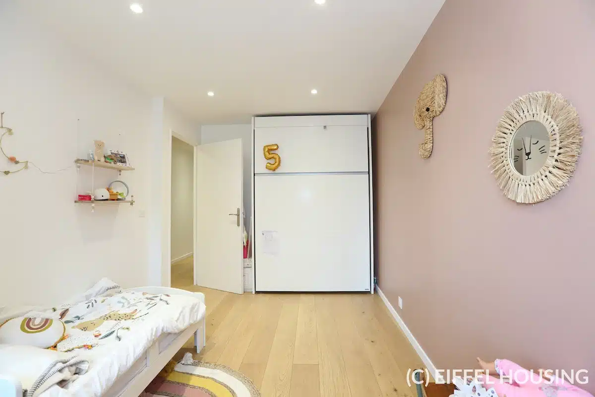 On the 2nd floor with elevator in a modern building. This 118 sqm unit includes a large living room with its open plan fully-equipped kitchen, a large master bedroom with its ensuite shower room, two kids’ bedrooms (one with a jersey bed), a bathroom (with bath tub) and two separate toilet. Kids bedrooms furniture can be adjusted according to tenants needs.