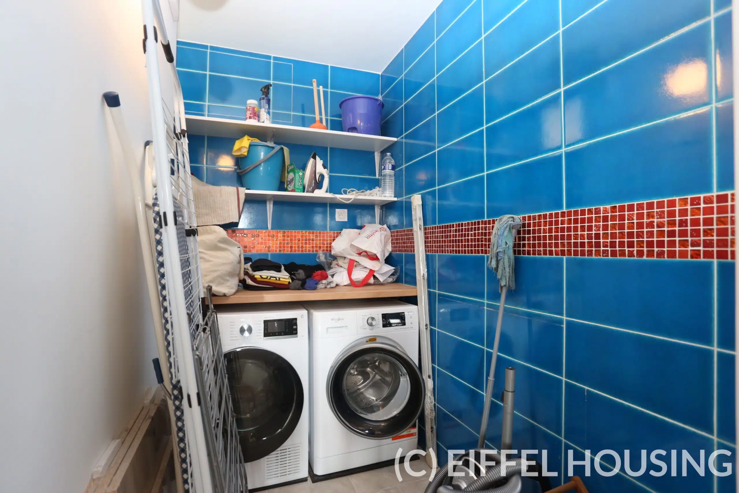 The apartment comprises an entrance hall with storage space, a large double living-dining room, a separate fitted and equipped kitchen, four bedrooms, one bathroom, one showeroom, two separate WCs, and a laundry room (washing machine and dryer).