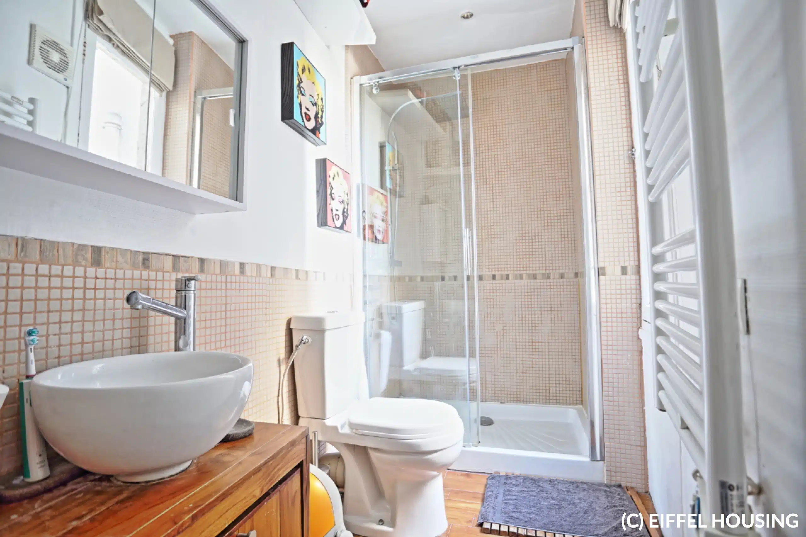 The apartment is on the 4th floor (no elevator) and features 1 living room, 1 fully equipped kitchen with new appliances, 1 bedroom on courtyard (with a view on Moulin Rouge theater), one bathroom with walk-in shower, one WC.