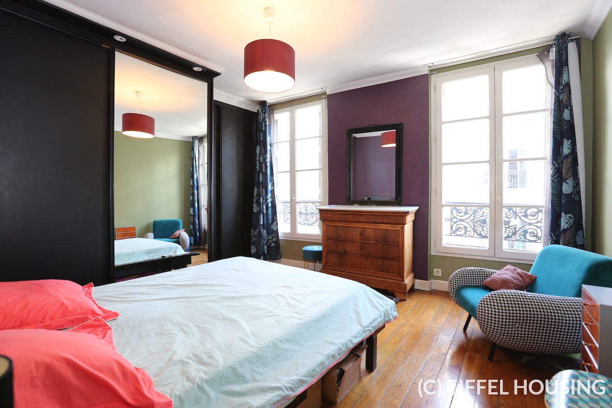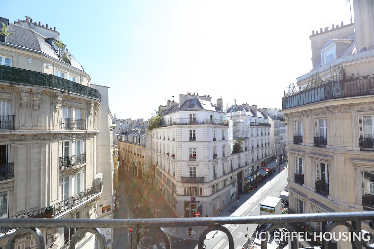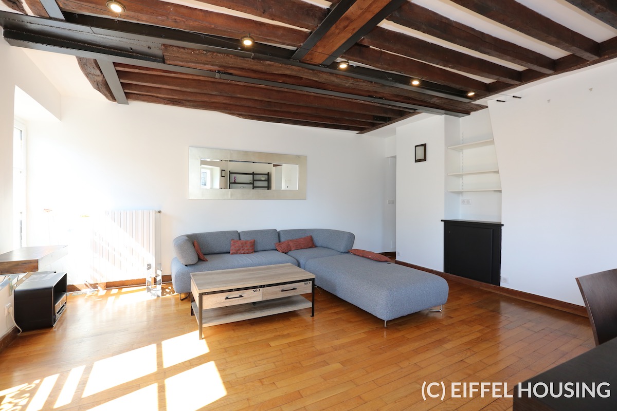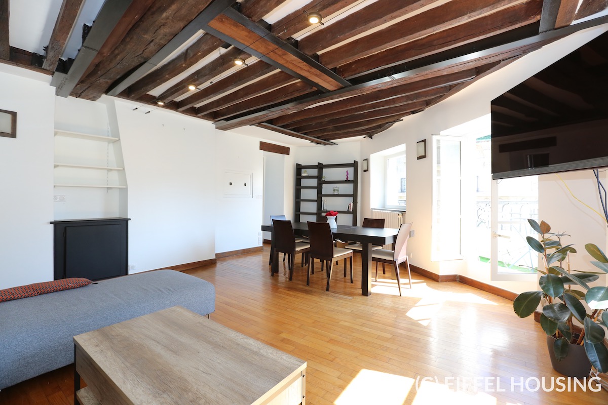 - a large sunbathed living room (eastern exposure with stunning view onto rue Rambuteau)