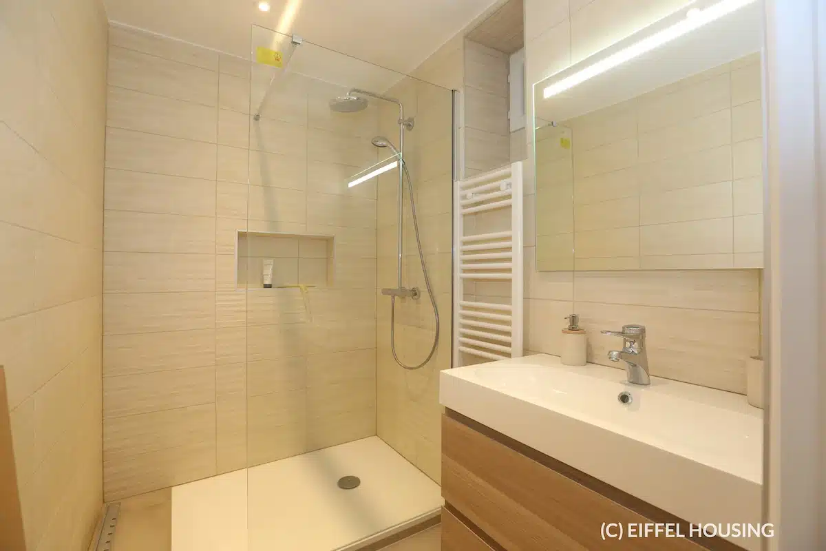 On the 1st floor (with elevator), this brand new 40 sqm property features a large living room of ~25m2, an fully equipped open plan kitchen (fridge, oven, microwave, cooker hood, hob, dishwasher, washing machine/dryer), a bedroom, a shower room and separate WC.